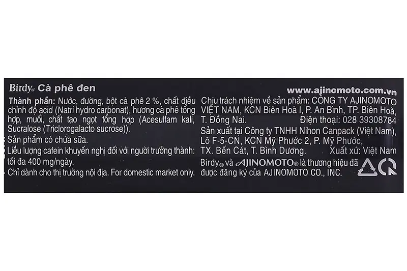Thành phần: Nước, đường, bột cà phê (2,8%), chất điều chỉnh độ chua (natri hydro cacbonat 500ii), hương cà phê tổng hợp, chất ngọt tổng hợp (acesulfam kali 950, sucraloza 955).