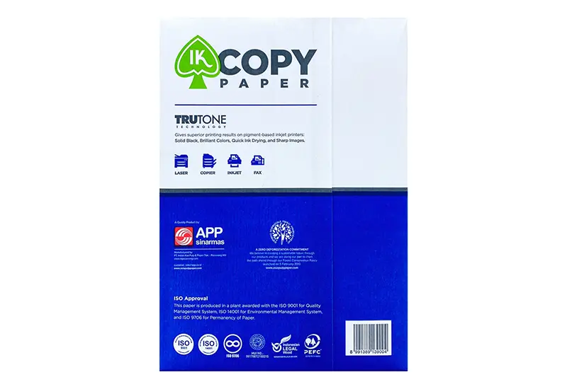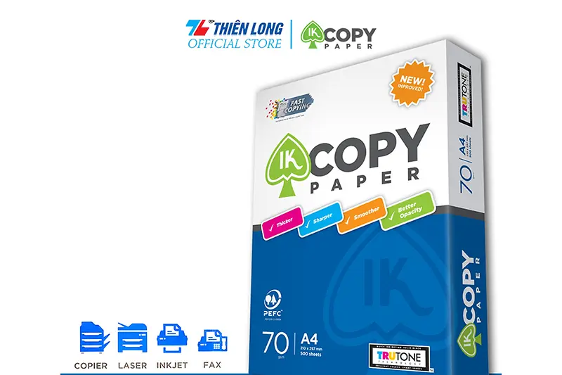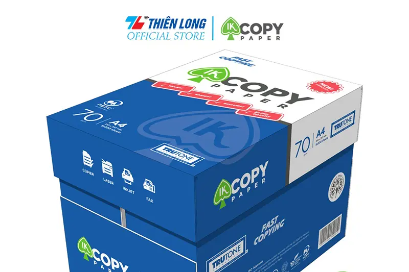 Đặc điểm sản phẩm: - Giấy đều màu. - Không gợn sóng, không xơ xước và không tách lớp. - Giấy láng, không bị đốm khác màu hay tạp chất xơ cứng. - Chữ in không bị nhòe, không lem kể cả in 2 mặt giấy. Cải tiến: - Độ dày nâng cao, Độ chắn sáng cao, Độ mịn cải tiến, Hình ảnh sắc nét hơn. Thích hợp sử dụng: - In ấn, photocopy, viết tay.